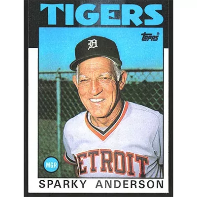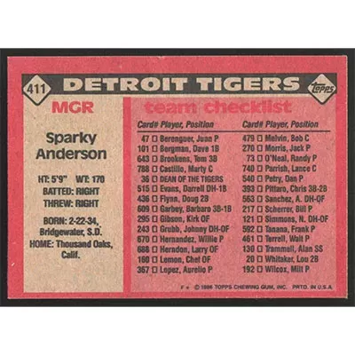 This is a 1986 Topps Sparky Anderson Team Checklist baseball card. The card is #411 and pictures show condition.