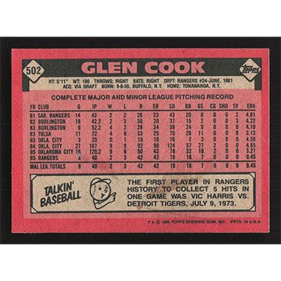 This is a 1986 Topps Glen Cook baseball card. The card is #502 and pictures show condition.