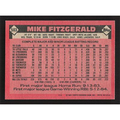 This is a 1986 Topps Mike Fitzgerald baseball card. The card is #503 and pictures show condition.