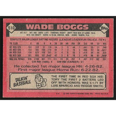 This is a 1986 Topps Wade Boggs baseball card. The card is #510 and pictures show condition.