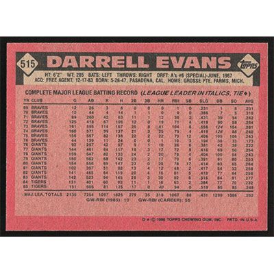 This is a 1986 Topps Darrell Evans baseball card. The card is #515 and pictures show condition.