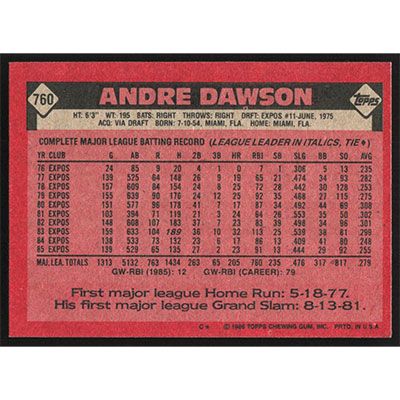 This is a 1986 Topps Andre Dawson baseball card. The card is #760 and pictures show condition.