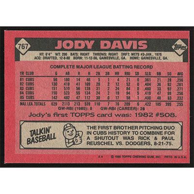This is a 1986 Topps Jody Davis baseball card. The card is #767 and pictures show condition.