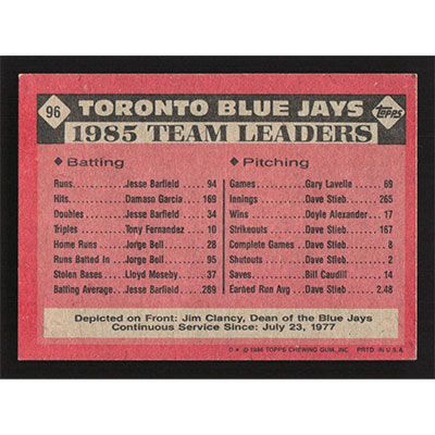 This is a 1986 Topps Jim Clancy Team Leaders baseball card. The card is #96 and pictures show condition.