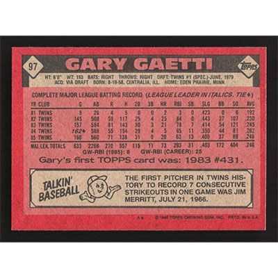 This is a 1986 Topps Gary Gaetti baseball card. The card is #97 and pictures show condition.