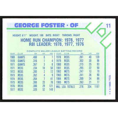 This is a 1986 Topps Baseball Champion Superstars George Foster baseball card. The card is #11 and pictures show condition.