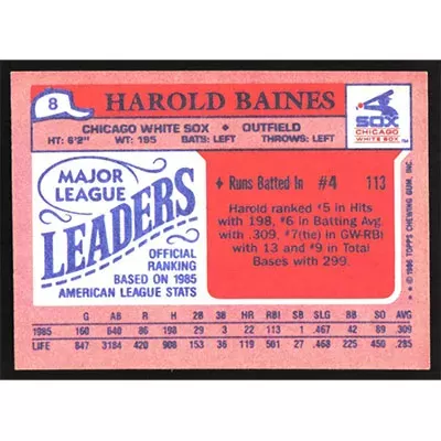 This is a 1986 Topps Mini Leaders Harold Baines baseball card. The card is #8 and pictures show condition.