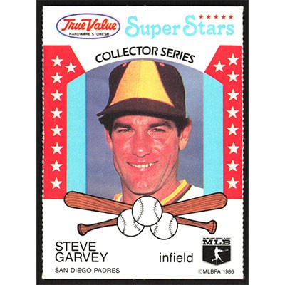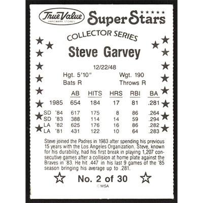 This is a 1986 True Value Steve Garvey baseball card. The card is #2 and pictures show condition.