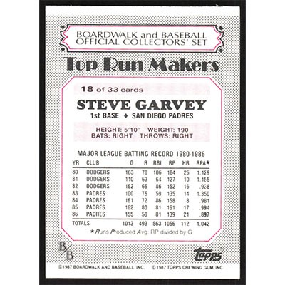 This is a 1987 Boardwalk and Baseball Steve Garvey baseball card. The card is #18 and pictures show condition.