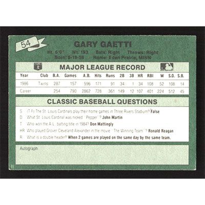 This is a 1987 Classic Game Gary Gaetti baseball card. The card is #54 and pictures show condition.