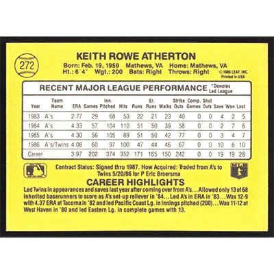 This is a 1987 Donruss Keith Atherton baseball card. The card is #272 and pictures show condition.