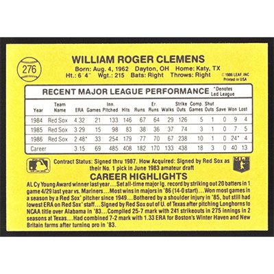 This is a 1987 Donruss Roger Clemens baseball card. The card is #276 and pictures show condition.