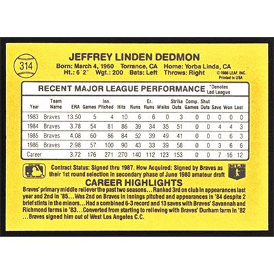 This is a 1987 Donruss Jeff Dedmon baseball card. The card is #314 and pictures show condition.