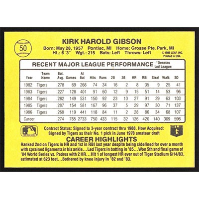 This is a 1987 Donruss Kirk Gibson baseball card. The card is #50 and pictures show condition.
