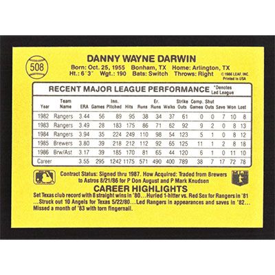 This is a 1987 Donruss Danny Darwin baseball card. The card is #508 and pictures show condition.