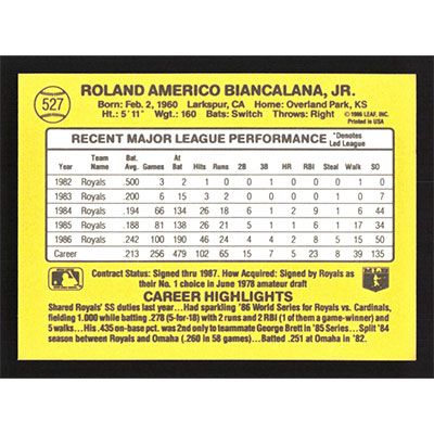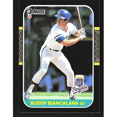 This is a 1987 Donruss Buddy Biancalana baseball card. The card is #527 and pictures show condition.