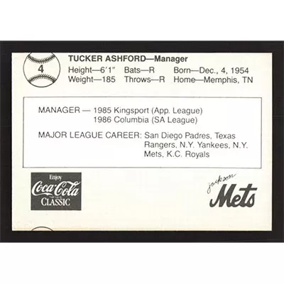 This is a 1987 Feder Jackson Mets Tucker Ashford baseball card. The card is #4 and pictures show condition.
