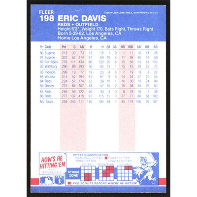 This is a 1987 Fleer Eric Davis baseball card. The card is #198 and pictures show condition.