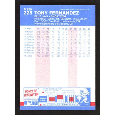This is a 1987 Fleer Tony Fernandez baseball card. The card is #225 and pictures show condition.