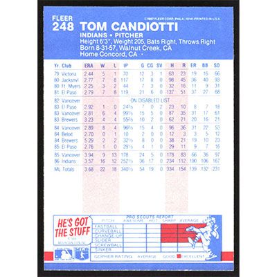 This is a 1987 Fleer Tom Candiotti baseball card. The card is #248 and pictures show condition.