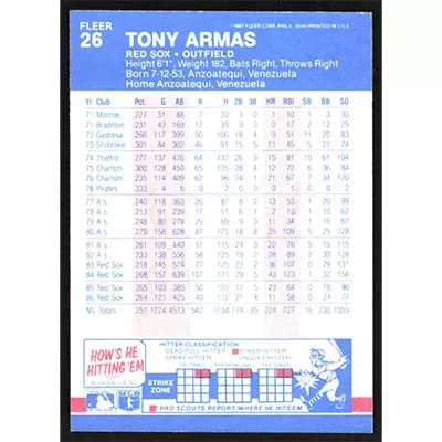 This is a 1987 Fleer Tony Armas baseball card. The card is #26 and pictures show condition.