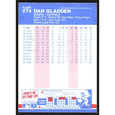 This is a 1987 Fleer Dan Gladden baseball card. The card is #274 and pictures show condition.
