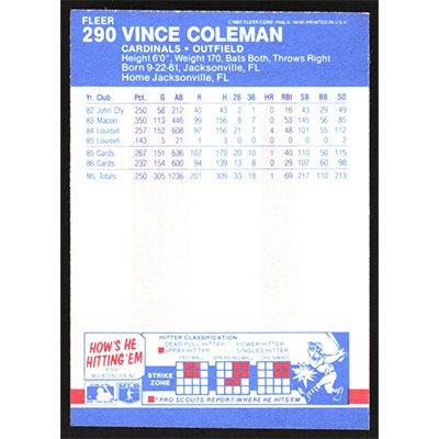 This is a 1987 Fleer Vince Coleman baseball card. The card is #290 and pictures show condition.