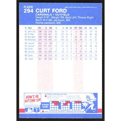 This is a 1987 Fleer Curt Ford baseball card. The card is #294 and pictures show condition.