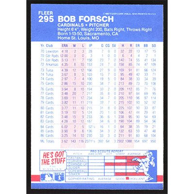 This is a 1987 Fleer Bob Forsch baseball card. The card is #295 and pictures show condition.