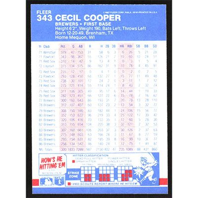 This is a 1987 Fleer Cecil Cooper baseball card. The card is #343 and pictures show condition.