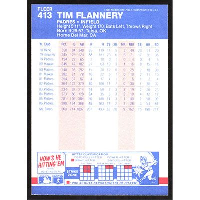 This is a 1987 Fleer Tim Flannery baseball card. The card is #413 and pictures show condition.