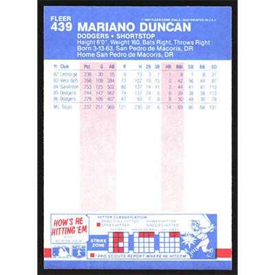 This is a 1987 Fleer Mariano Duncan baseball card. The card is #439 and pictures show condition.