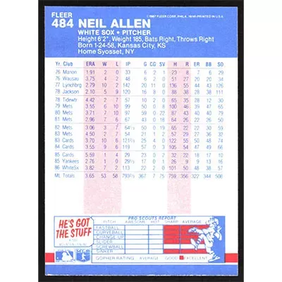 This is a 1987 Fleer Neil Allen baseball card. The card is #484 and pictures show condition.