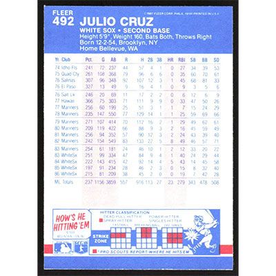 This is a 1987 Fleer Julio Cruz baseball card. The card is #492 and pictures show condition.