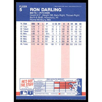 This is a 1987 Fleer Ron Darling baseball card. The card is #5 and pictures show condition.