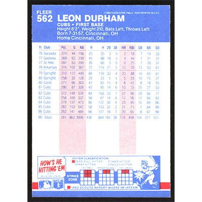 This is a 1987 Fleer Leon Durham baseball card. The card is #562 and pictures show condition.