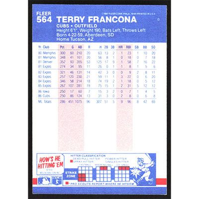 This is a 1987 Fleer Terry Francona baseball card. The card is #564 and pictures show condition.