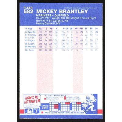 This is a 1987 Fleer Mickey Brantley baseball card. The card is #582 and pictures show condition.