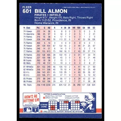 This is a 1987 Fleer Bill Almon baseball card. The card is #601 and pictures show condition.