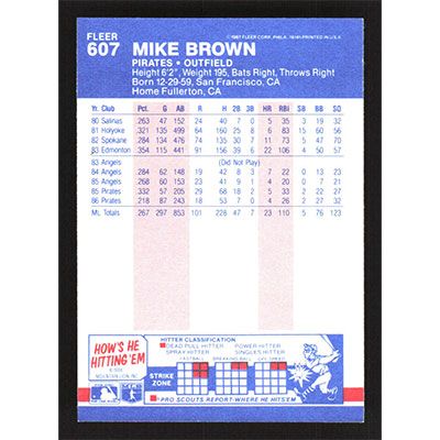 This is a 1987 Fleer Mike Brown baseball card. The card is #607 and pictures show condition.