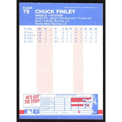 This is a 1987 Fleer Chuck Finley baseball card. The card is #79 and pictures show condition.