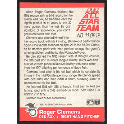 This is a 1987 Fleer All-Stars Roger Clemens baseball card. The card is #11 and pictures show condition.