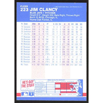 This is a 1987 Fleer Glossy Jim Clancy baseball card. The card is #223 and pictures show condition.