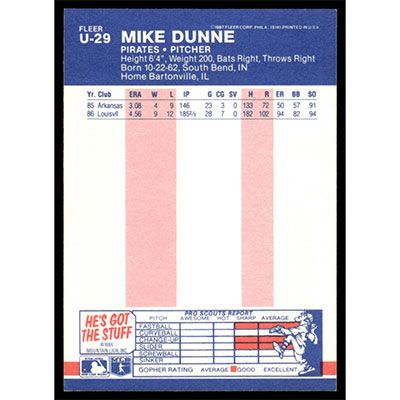 This is a 1987 Fleer Update Mike Dunne baseball card. The card is #U-29 and pictures show condition.