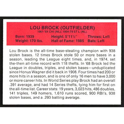 This is a 1987 Hygrade All-Time Greats Lou Brock baseball card. The card is #NNO and pictures show condition.