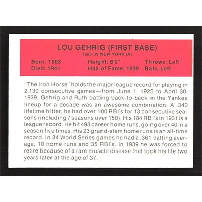 This is a 1987 Hygrade All-Time Greats Lou Gehrig Orange baseball card. The card is #NNO and pictures show condition.