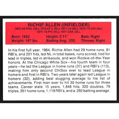 This is a 1987 Hygrade All-Time Greats Richie Allen baseball card. The card is #NNO and pictures show condition.