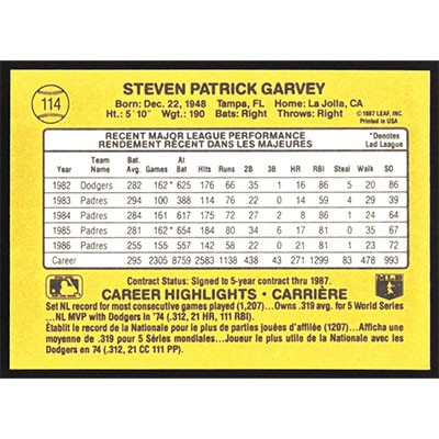 This is a 1987 Leaf Steve Garvey baseball card. The card is #114 and pictures show condition.