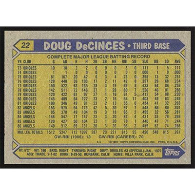 This is a 1987 Topps Doug DeCinces baseball card. The card is #22 and pictures show condition.