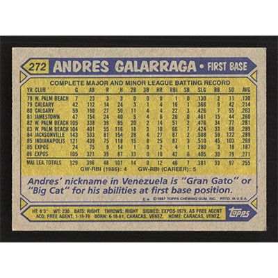 This is a 1987 Topps Andres Galarraga baseball card. The card is #272 and pictures show condition.